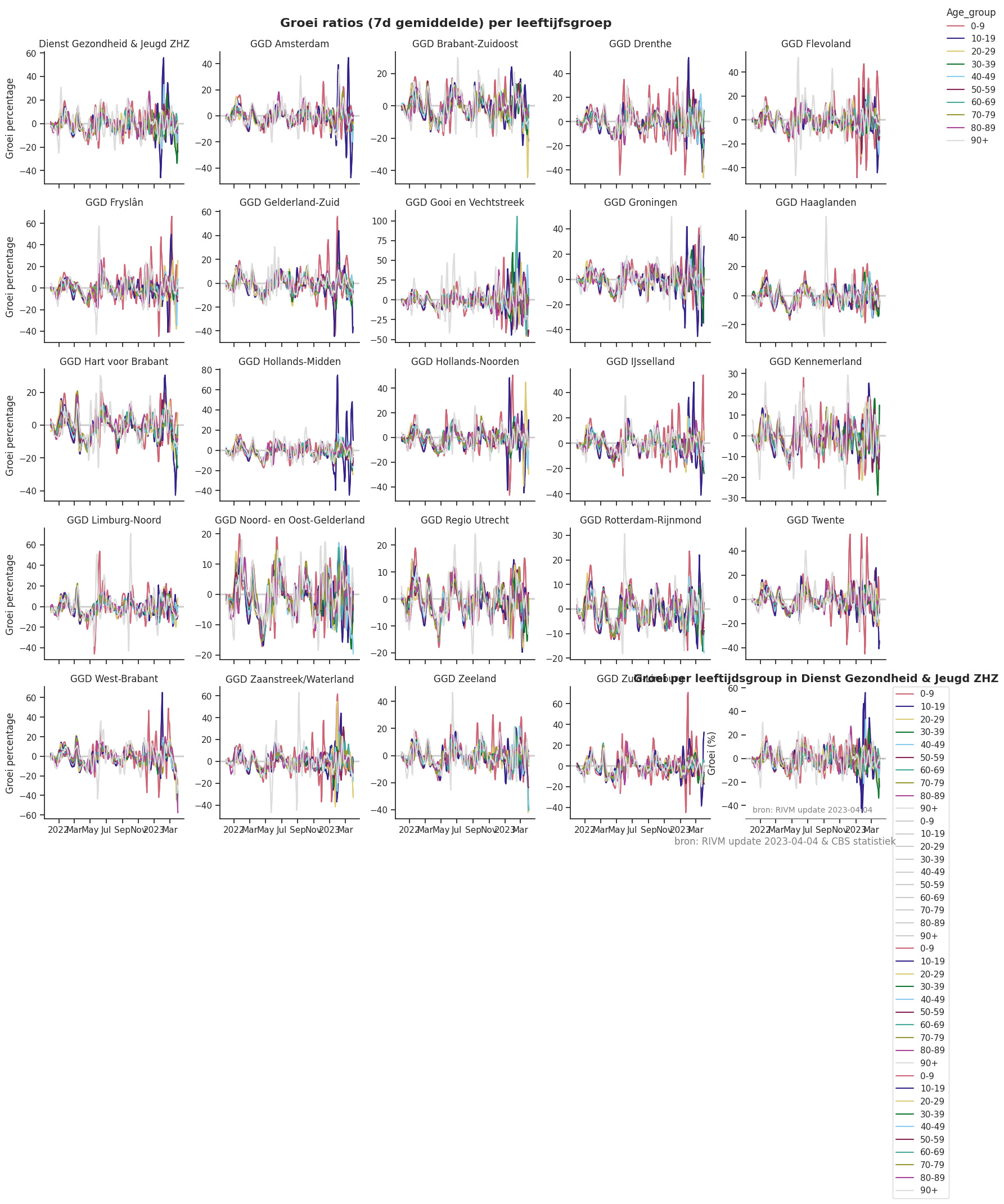 g.fig.suptitle('Groei ratios (7d gemiddelde) per leeftijfsgroep', size=16.0, weight='bold')