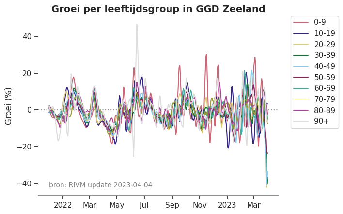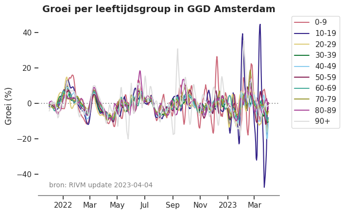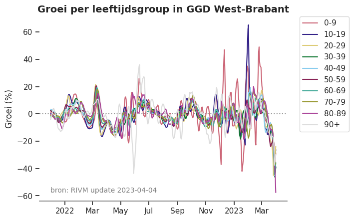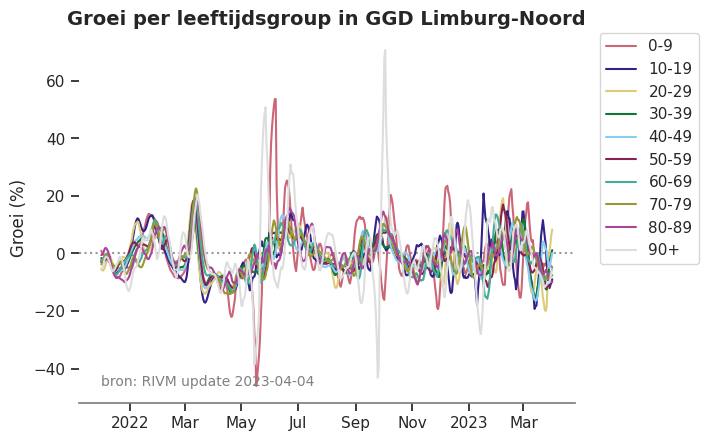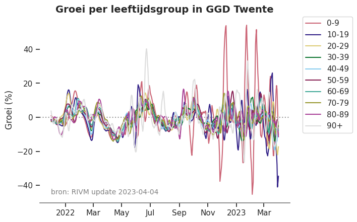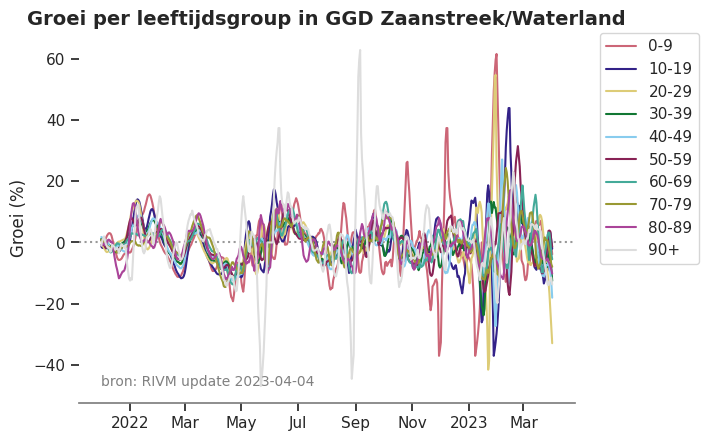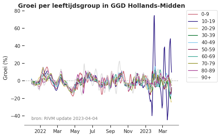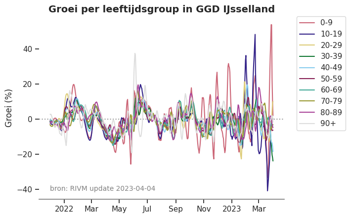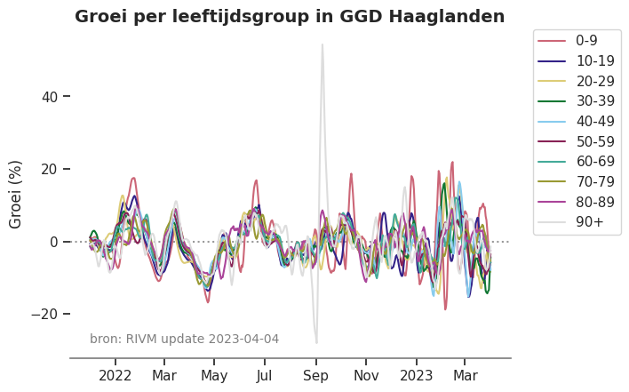 s.set_title("Groei per leeftijdsgroup in " + ggdName, fontdict={'fontsize':14,'fontweight': 'bold'})