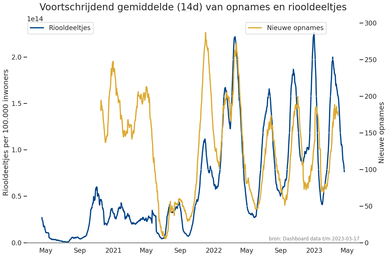 ax.set_title('Voortschrijdend gemiddelde (14d) van opnames en riooldeeltjes', pad=30)