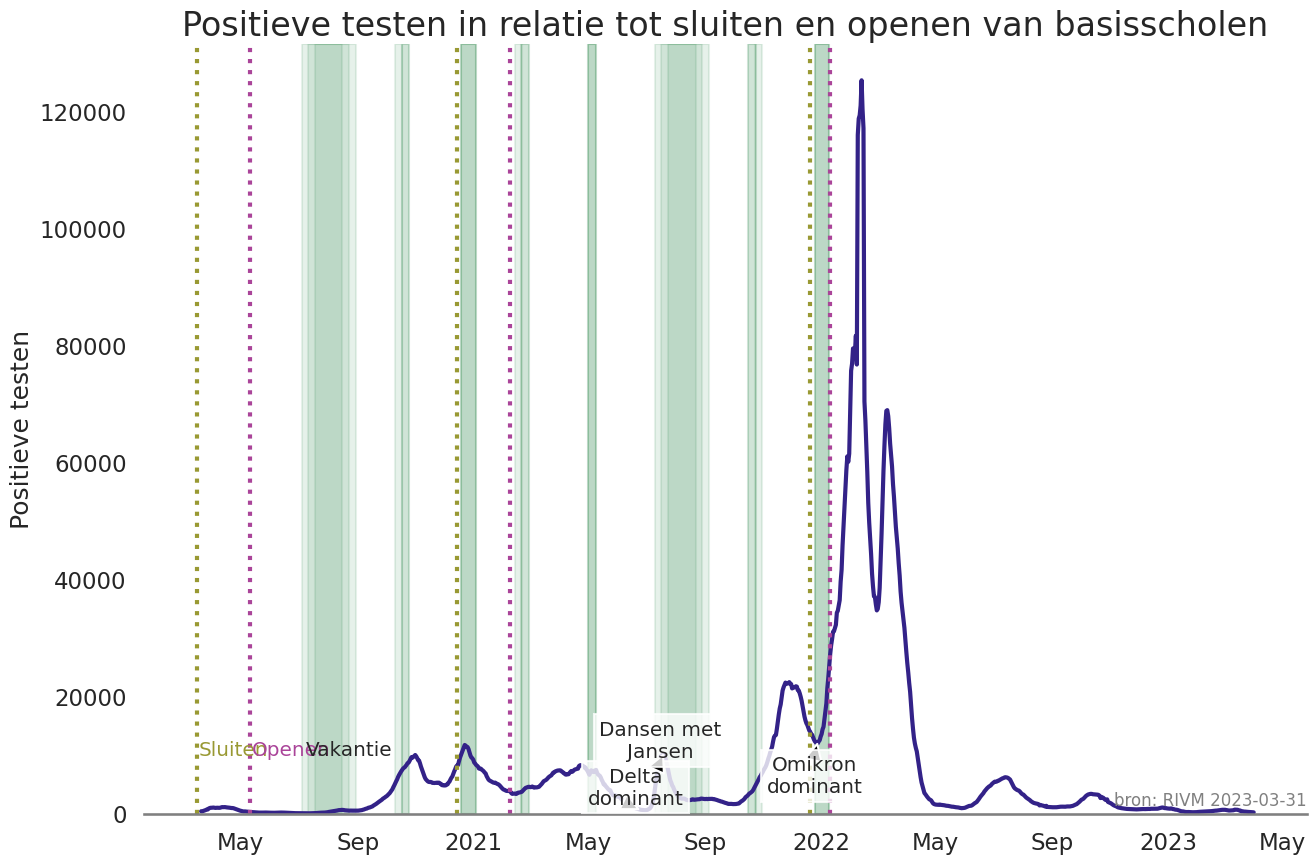 ax.set_title('Positieve testen in relatie tot sluiten en openen van basisscholen', pad=30)