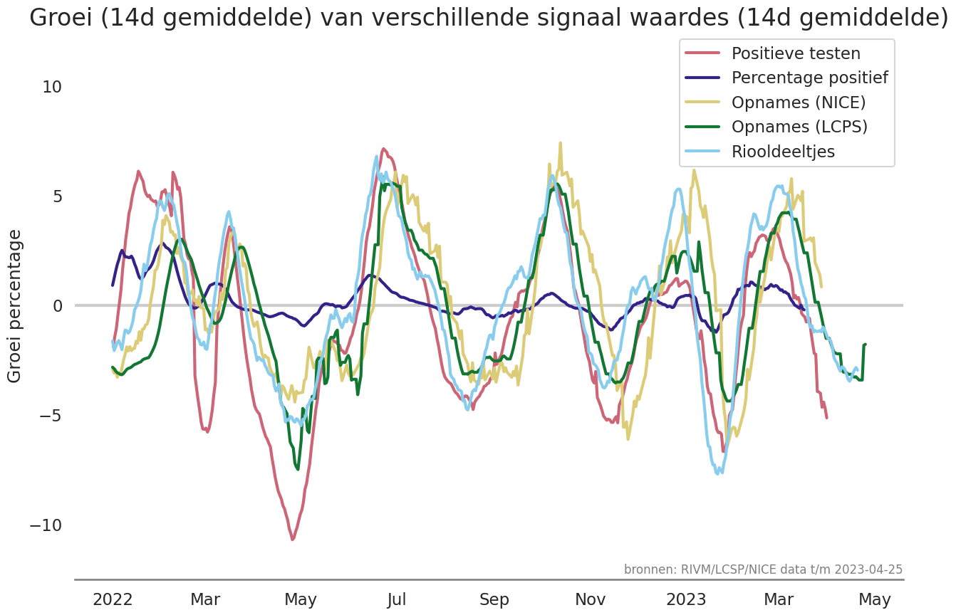 g.set_title('Groei (14d gemiddelde) van verschillende signaal waardes (14d gemiddelde)', pad=30)